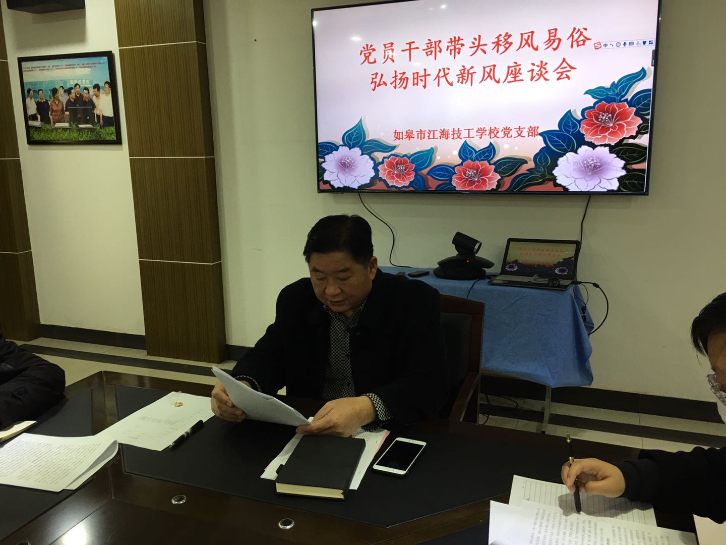 根據(jù)中共如皋市紀(jì)律檢查委員會(huì)、中共如皋市委組織部、中共如皋市委宣傳部的部署要求,3月24日上午,我校黨支部組織全校黨員召開“帶頭移風(fēng)易俗、弘揚(yáng)時(shí)代新風(fēng)”座談會(huì)。