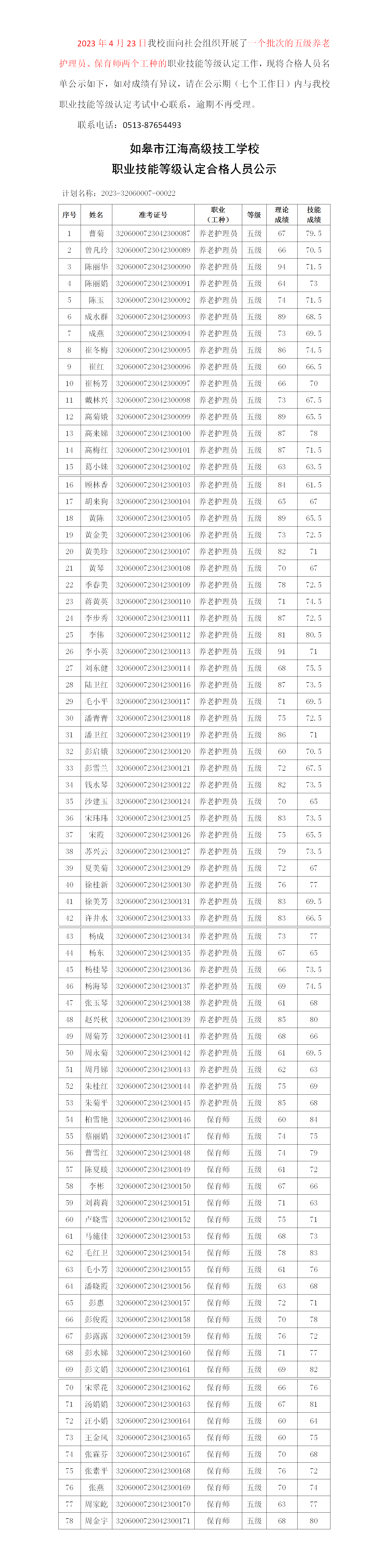 2023-32060007-00022批次職業(yè)技能等級認(rèn)定合格人員公示