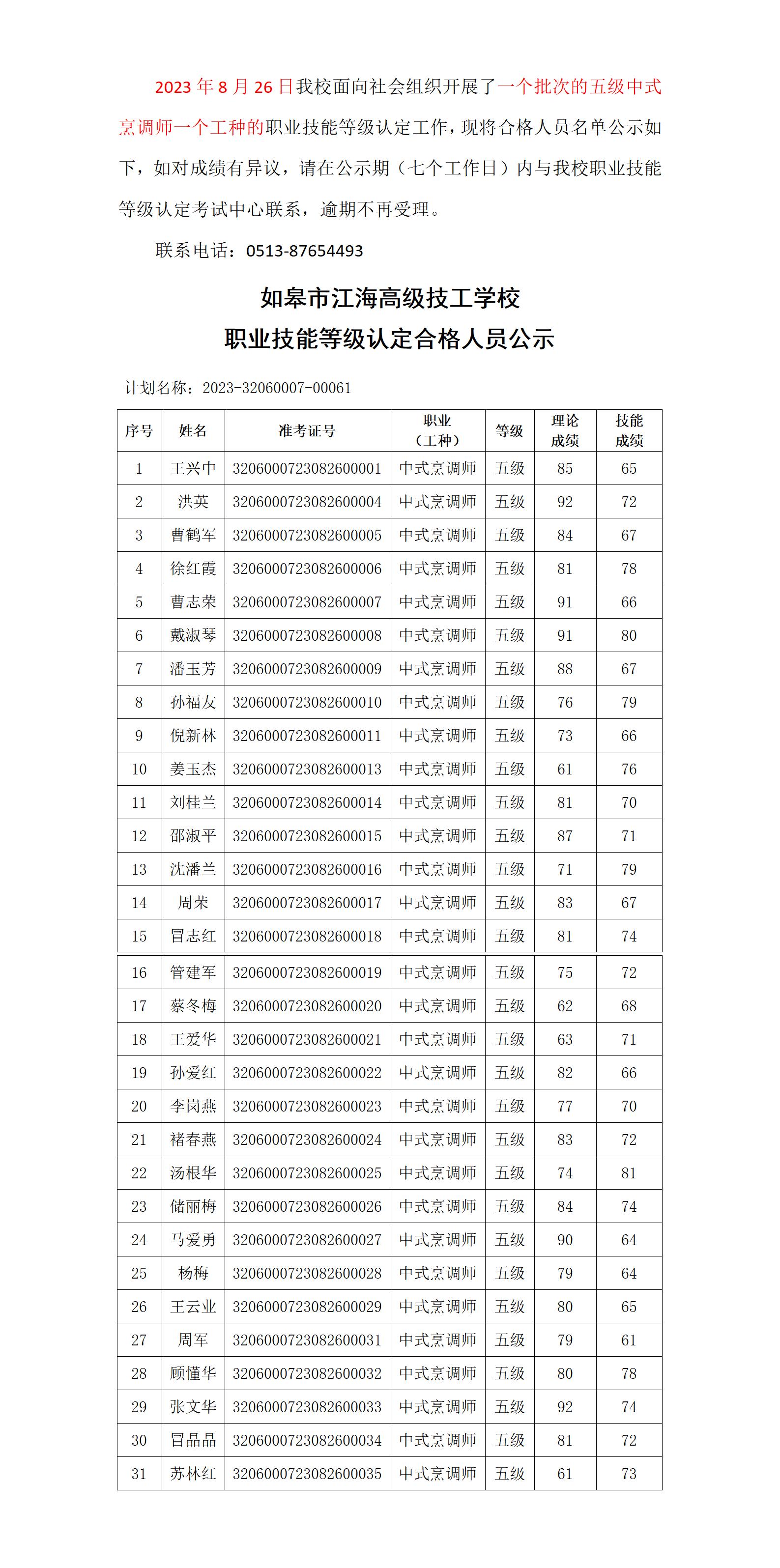 2023-32060007-00061批次職業(yè)技能等級認定合格人員公示