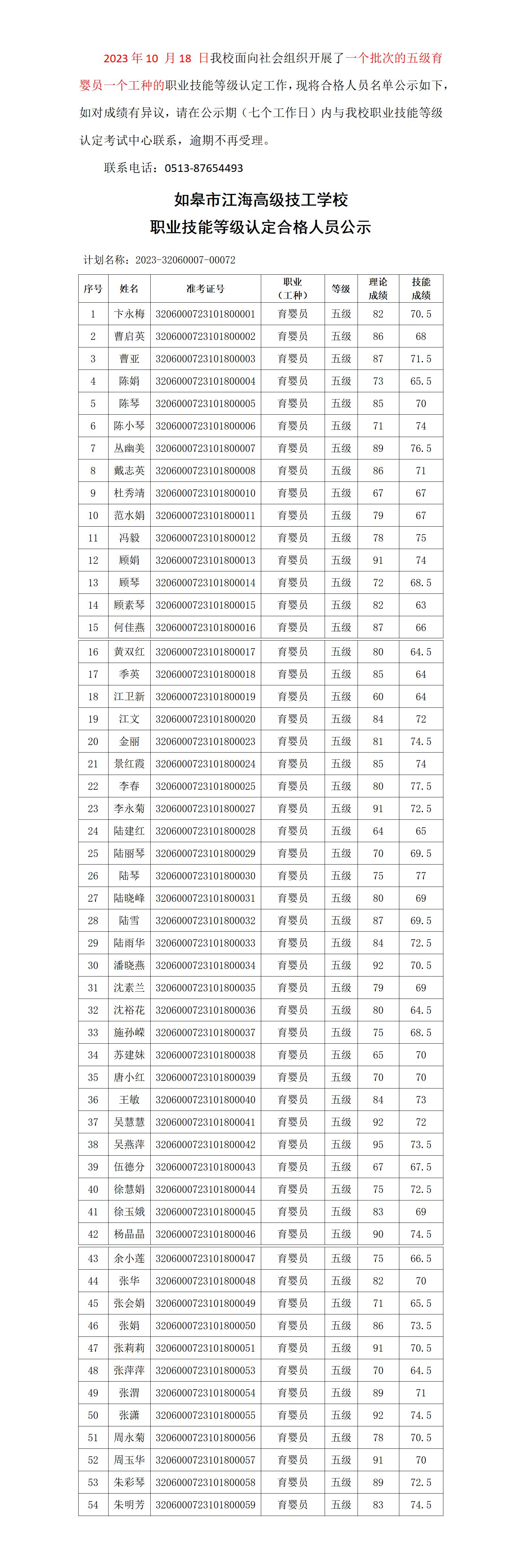 2023-32060007-00072批次職業(yè)技能等級(jí)認(rèn)定合格人員公示