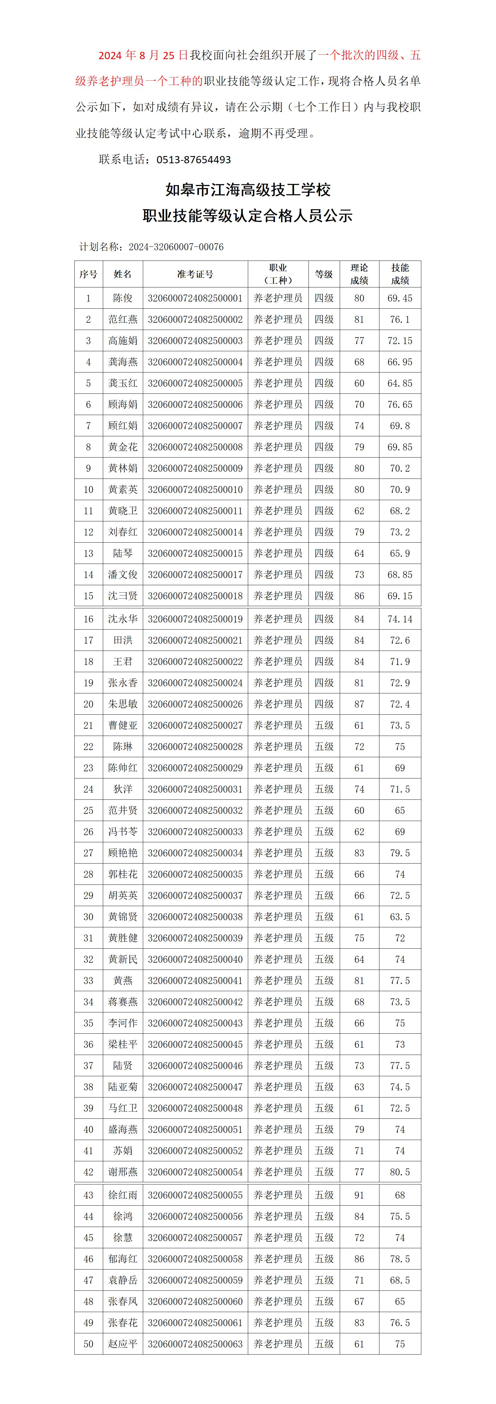 2024-32060007-00075批次職業(yè)技能等級(jí)認(rèn)定合格人員公示
