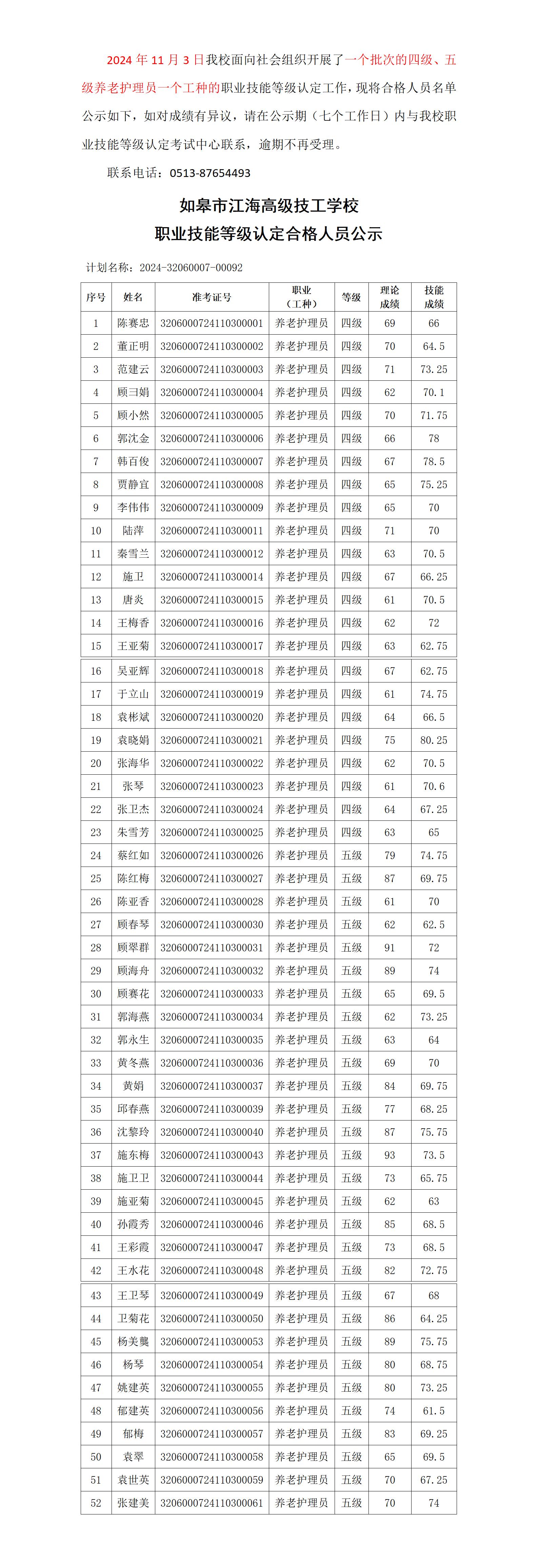 2024-32060007-00092批次職業(yè)技能等級(jí)認(rèn)定合格人員公示