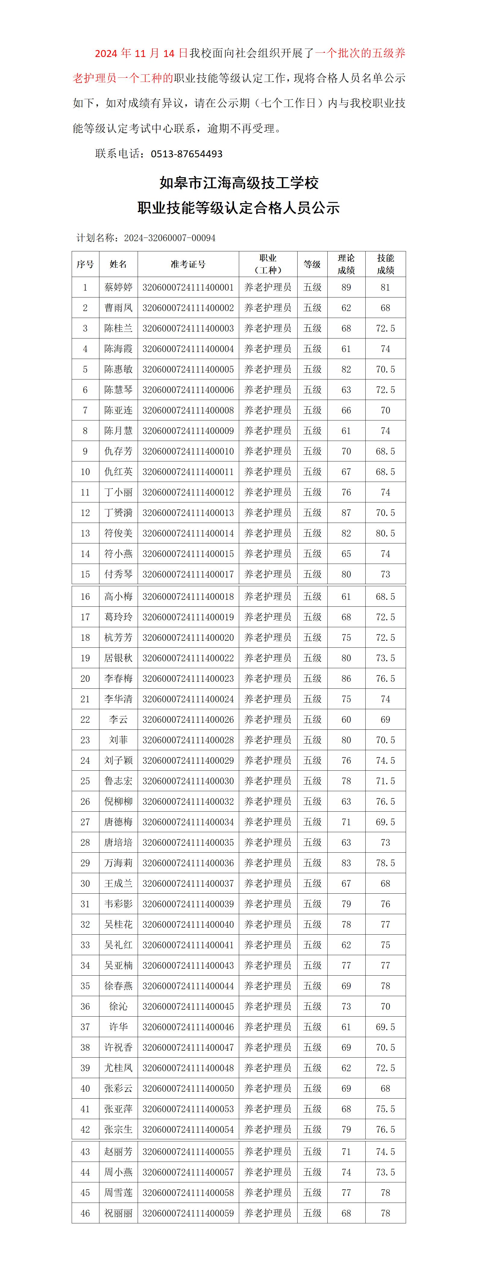 2024-32060007-00094批次職業(yè)技能等級認(rèn)定合格人員公示