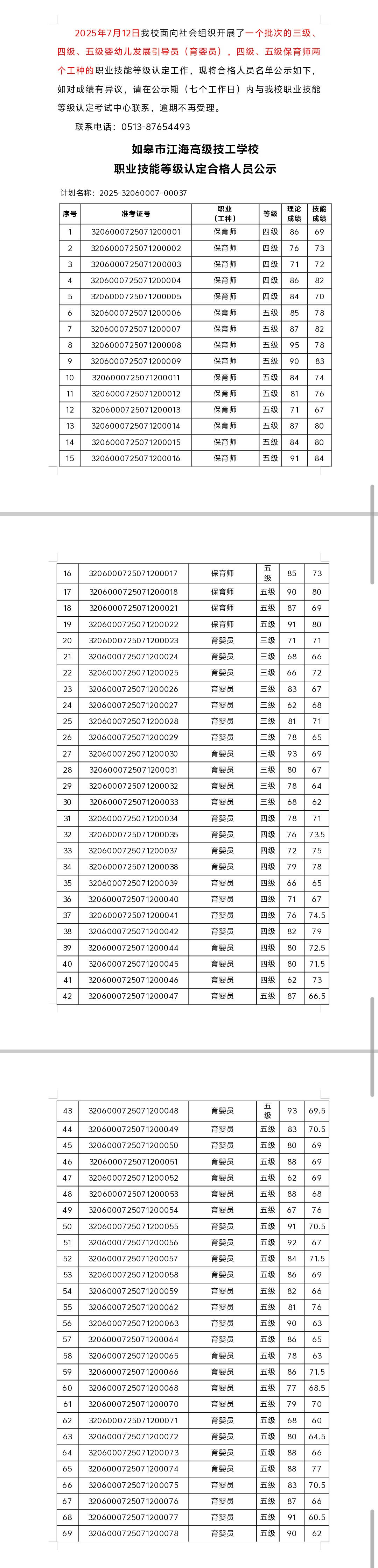 2025-32060007-00037批次職業(yè)技能等級認定合格人員公示