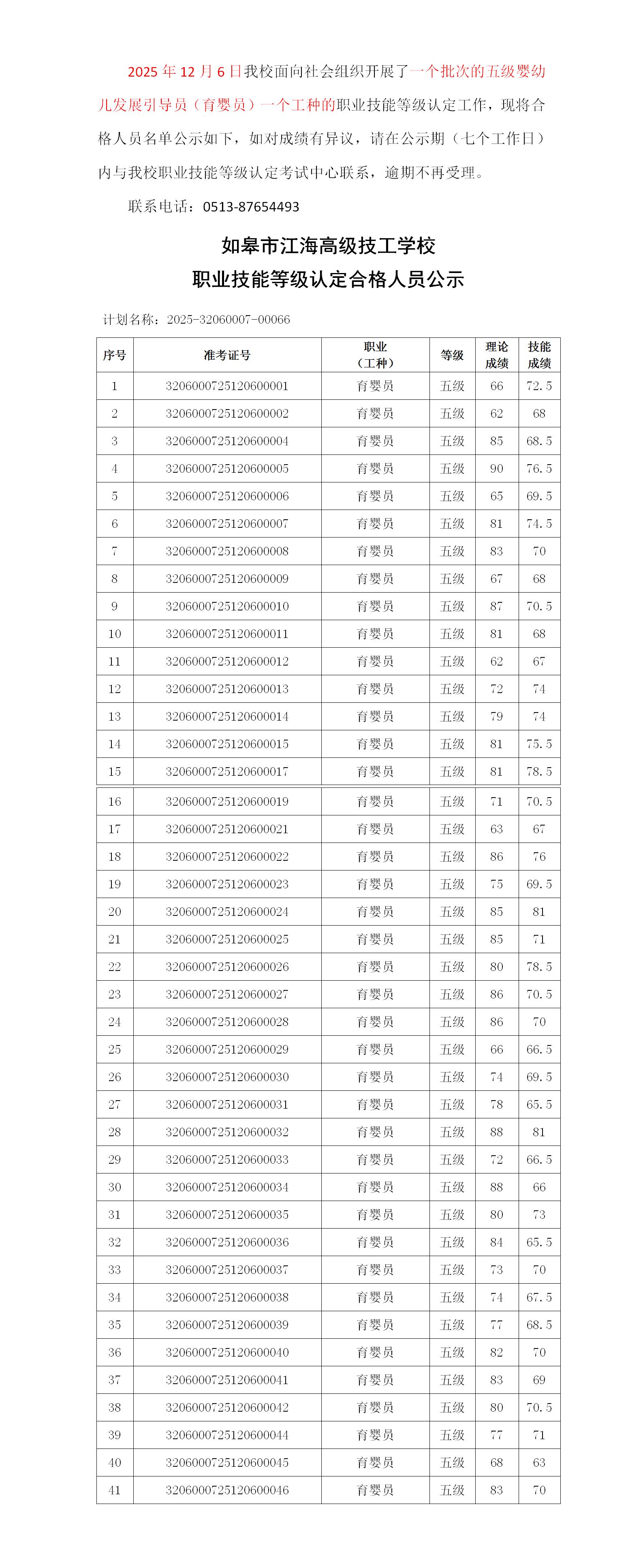 2025-32060007-00066批次職業(yè)技能等級認(rèn)定合格人員公示